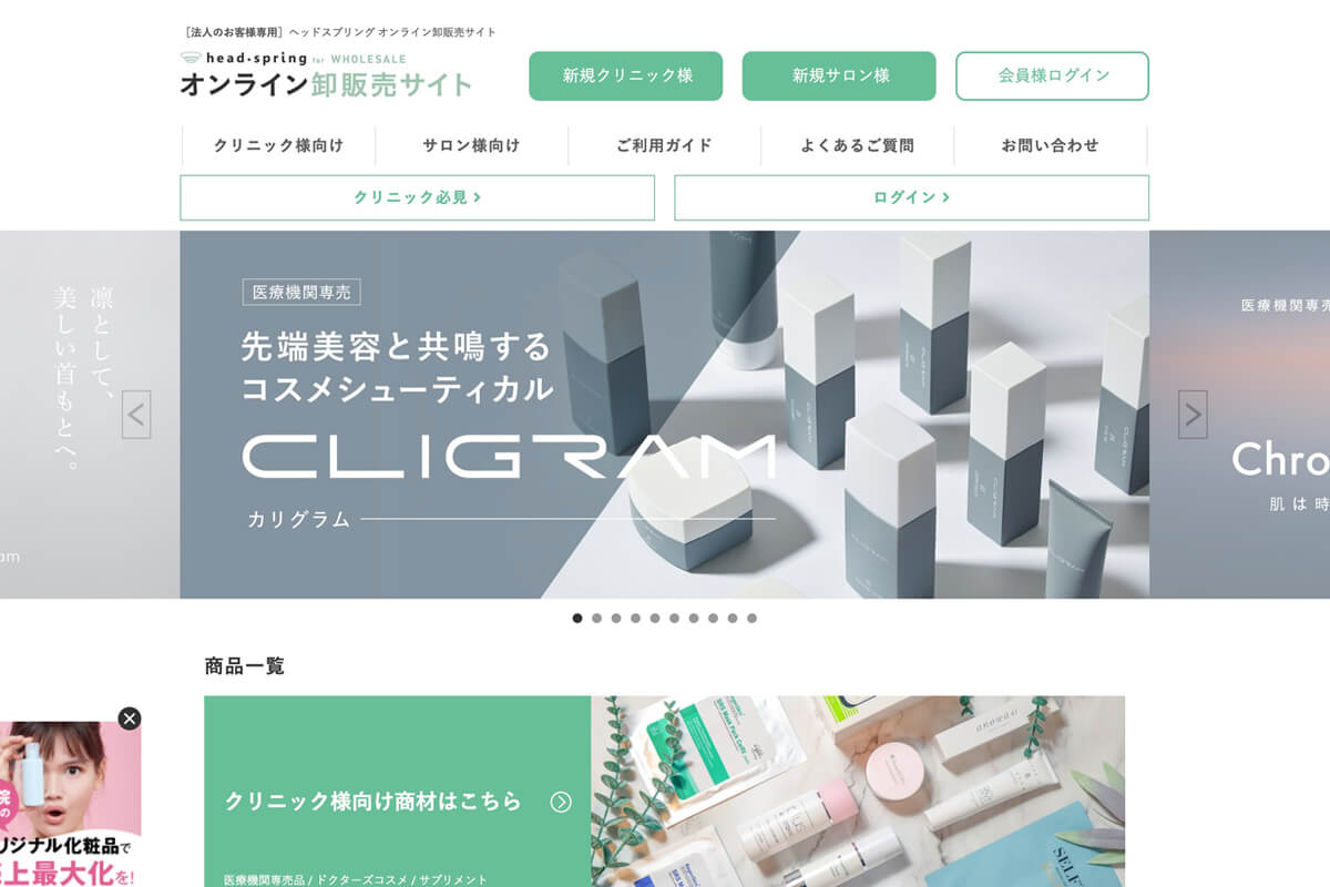 そこで当社では、多くのメーカーとのネットワークを駆使し、24時間365日、様々なメーカーの注目商材をWebで受注できるクリニック専用のオンライン卸販売サイトを構築。