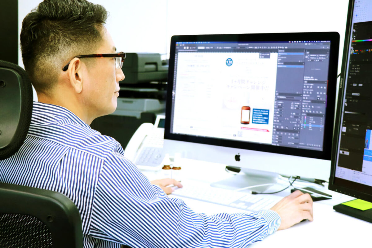 当社ではクライアントワークだけではなく、自社商品やサービスをアピールする制作ができることもやりがいのひとつ。化粧箱やラベルの制作などプロダクト寄りの制作についても、紙やWEBとは全く違った難しさや楽しさがあり、様々なコンテンツのデザインに携われる環境も当社ならではの魅力だと実感しています。また、すべての制作物については営業やコーディネーターと連携を取りながら、売上に直結させるための取組みができることにも面白さを感じています。